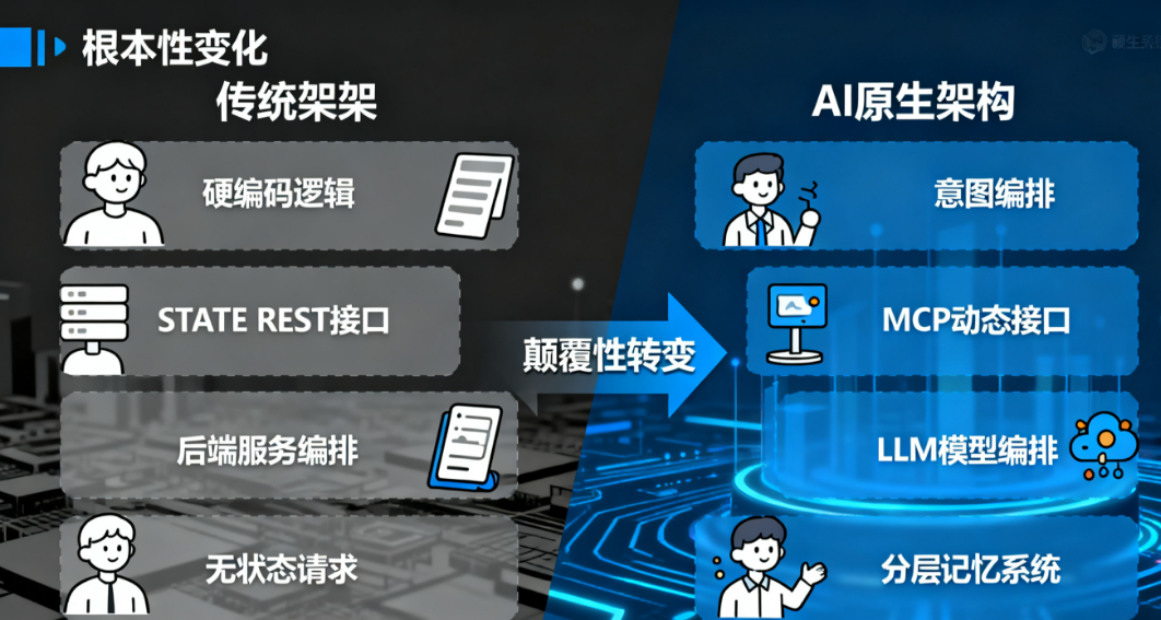传统架构的核心是 “确定性逻辑编码”,而 AI 原生应用以 “动态意图编排” 为内核,呈现出四项颠覆性转变:
